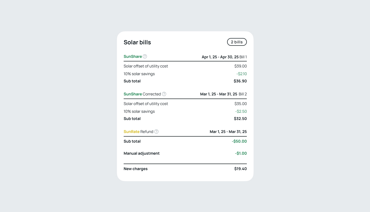- Because the resident originally paid $50 for March with SunRate, but their corrected charge is now $32.50, the difference is credited. After applying this correction and the new April SunShare charge, the total new charges for the period amount to $19.40.